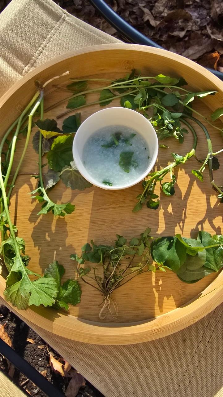 朝食は、採取した野草の粥膳です。